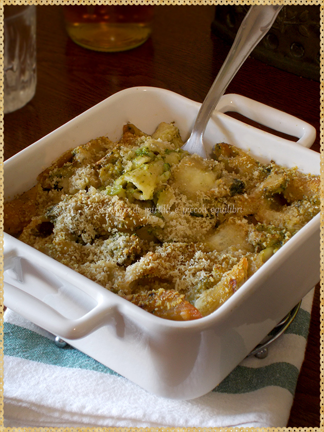 E’ una pasta, in questo caso pennoni rigati cotti in forno con broccoli ripassati in padella, nodini di fiordilatte ed una superficie di formaggio grattugiato e pangrattato per avere una crosticina che adoro.
