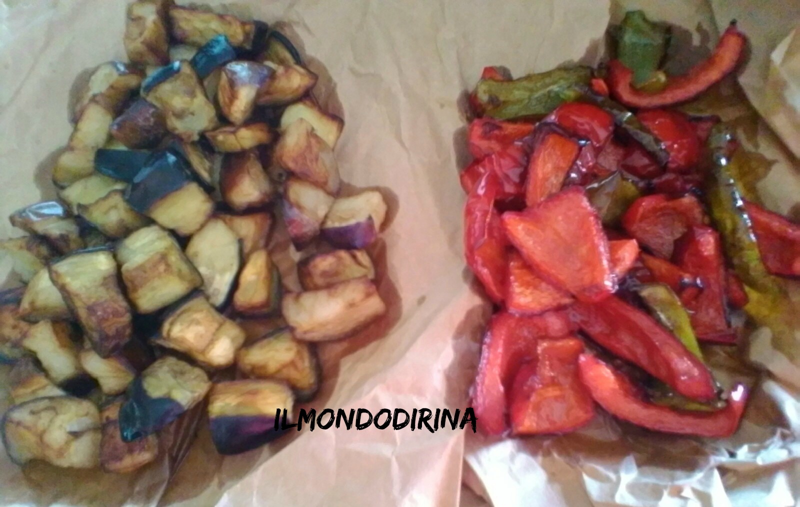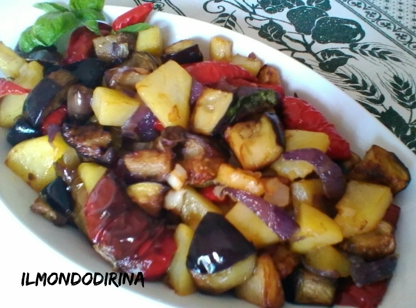 Lavate, asciugate e tagliate a pezzi grossolani le melanzane, cospargetele di sale e lasciatele spurgare in uno scolapasta per mezz’ora. Nel frattempo sbucciate, lavate, asciugate e tagliate a listarelle le patate e i peperoni. Prendete una padella, fate scaldare bene l’olio evo e friggete le melanzane fin quando saranno ben dorate. Nello stesso olio friggete poi i peperoni. Una volta pronti fateli asciugare su carta assorbente.