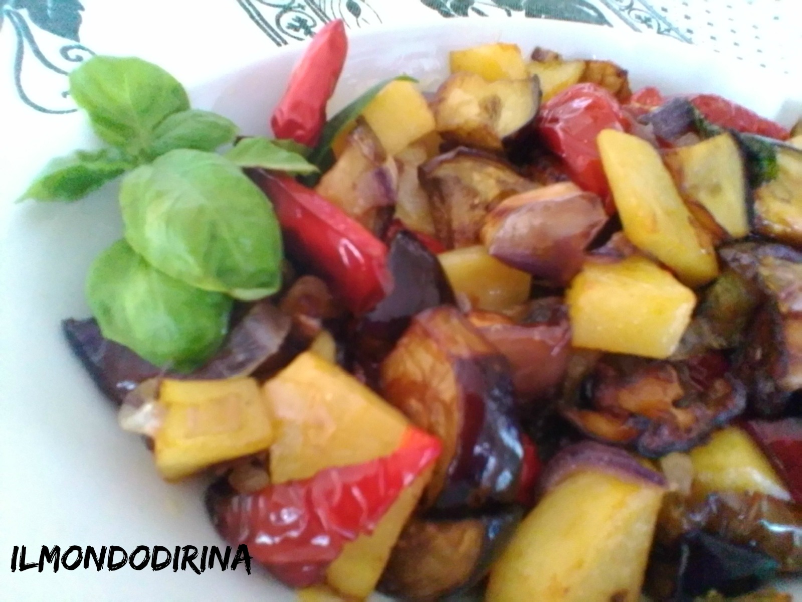 Fate cuocere a fuoco medio per evitare di bruciare la cipolla e a fine cottura unite i peperoni e le melanzane. Mescolate, salate e lasciate insaporire sul fuoco le verdure per cinque minuti. Versate poi il tutto su un piatto da portata e cospargetelo con basilico tritato ed origano.