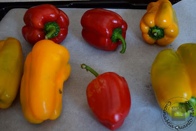 Coprite una teglia con carta forno. Accendete il forno a 200 gradi e fate appassire i peperoni per una mezz’ora circa, girando spesso su ogni lato.