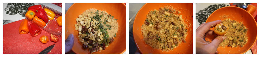 Con questo composto, riempite ogni singolo peperone premendo bene la farcia all’interno con le dita. Potete farlo semplicemente utilizzando un cucchiaino per versare all’interno delle verdure il composto poi con le dita, premete fino a livellare la superficie.