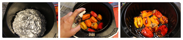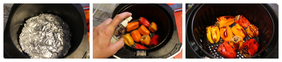 Disponete i peperoni all’interno del cestello e ungete leggermente o con un oliera spray oppure spennellando lì con l’olio. Cuocete a 200 gradi per 15-20 minuti, girando i peperoni a metà cottura. Il tempo varia a seconda della dimensione dei peperoni.