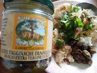 il pane ormai ammollato e ben strizzato, le Olive Taggiasche Denocciolate,