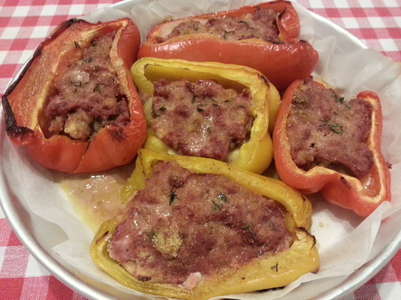 Bagnare le fette di pane con dell’acqua, poi strizzarle molto bene. In una ciotola mescolare la carne con il pane bagnato, l’uovo, il parmigiano, sale, una grattata di noce moscata, qualche filo di erba cipollina tagliuzzato e le foglioline di 4-5 rametti di timo. Ottenuto un impasto ben amalgamato, distribuirlo nei mezzi peperoni, sopra ai cubetti di formaggio. Cospargere con una leggera spolverata di pangrattato e un filo d’olio, quindi cuocere in forno a 200° per circa 30-40 minuti, finché i peperoni saranno leggermente appassiti e il ripieno ben colorito e asciutto.