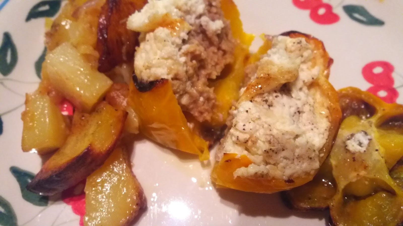 fatto con carne,mollica,uova,formaggi,sale e pepe..e terminate con la stracciatella,coprite con la calotta dei peperoni,cospargete di sale e pepe e poggiateli in una teglia,contornando il tutto con