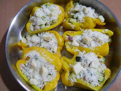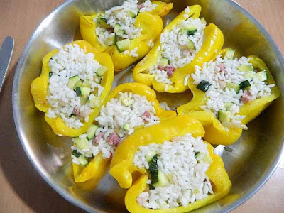 Riprendere i peperoni e riempirli con il riso e zucchine,