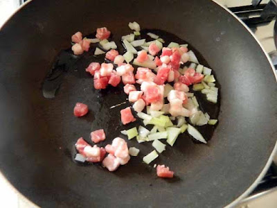 In una padella antiaderente facciamo appassire la cipolla con la pancetta,