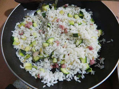 Cuocere il riso avendo cura di scolare il riso 5 minuti prima della completa cottura. Appena scolato il riso versarlo nella padella e