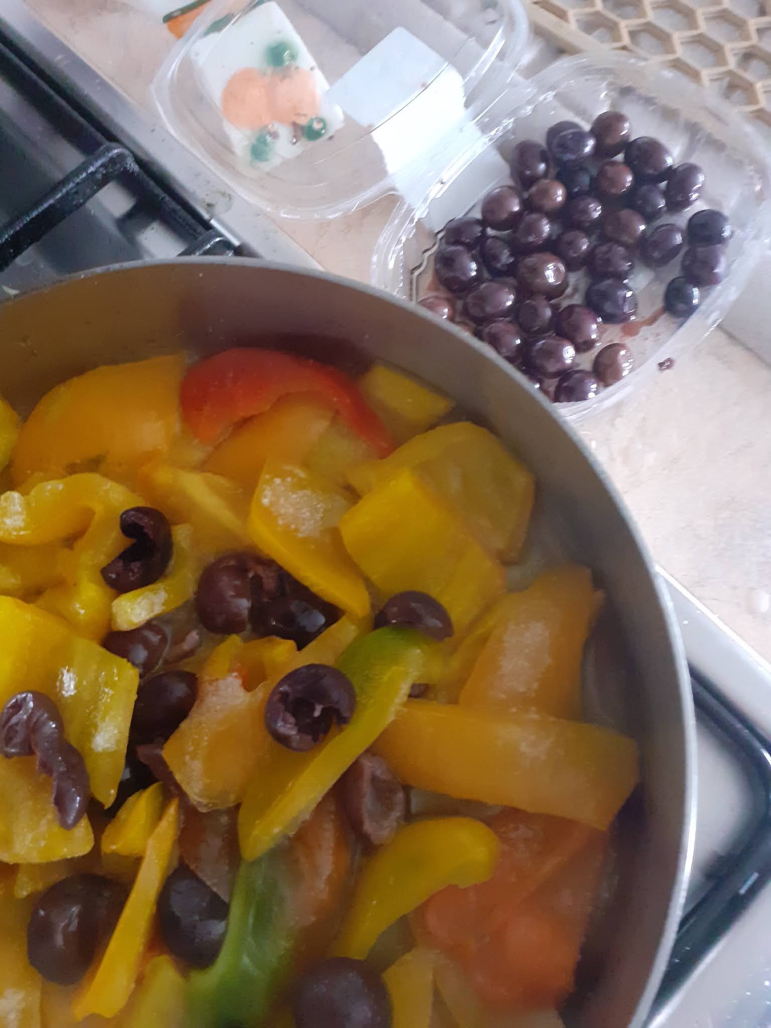 Lavare e privare del torsolo e dei semi i peperoni, stracciarli e metterli da parte, intanto facciamo rosolare olio e aglio ,poi uniamo i peperoni, le olive snocciolate, i capperi, poco sale e copriamo lasciando cuocere a fiamma media il tempo necessario…A mio marito non piacciono bruciacchiati e li lascio piu’ morbidi ma per me li faccio piu cotti..a pellicchiell!!(cioe’ piu’ consumati che si veda staccata la pelle del peperone)!!.Decidete come preferite.|||