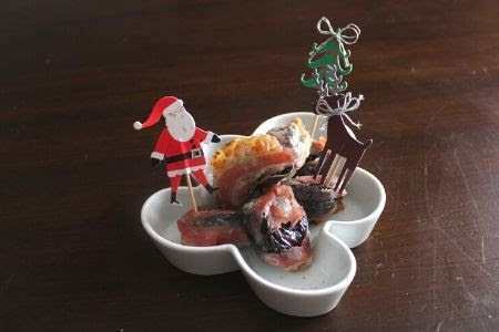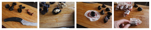 Se avete scelto delle prugne con il nocciolo eliminatelo, tagliatele a metà come se fossero un portafoglio. All’interno inserito un gheriglio di noce richiudete la prugna e avvolgetela nella fetta di pancetta.