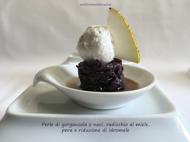 Ho così inserito nel mio piatto i contrasti tra le noti dolci del miele e dell’idromele e la sapidità del formaggio, l’amaro del radicchio e l’acidulo della pera, ma anche quelli tra il croccante della noce e la morbidezza del gorgonzola. Un finger food, perché quando non sono sicura tendo a “minimizzare”! Solo prodotti di altissima qualità perché il personaggio è davvero di livello molto molto alto.