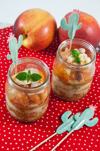 Servire la crema di ricotta e amaretti accompagnata dalle pesche stufate e da un cucchiaio di mandorle a scaglie tostate.