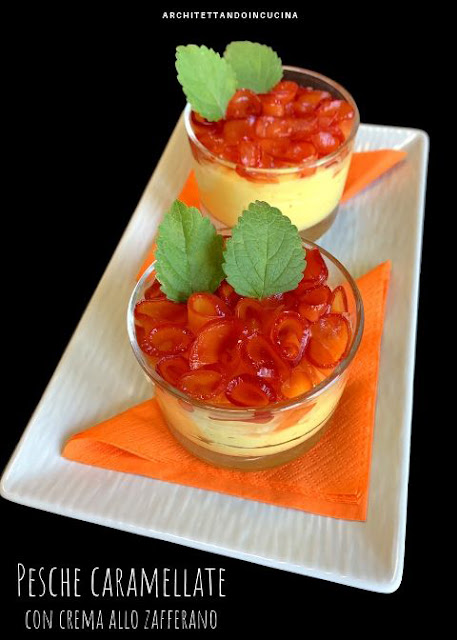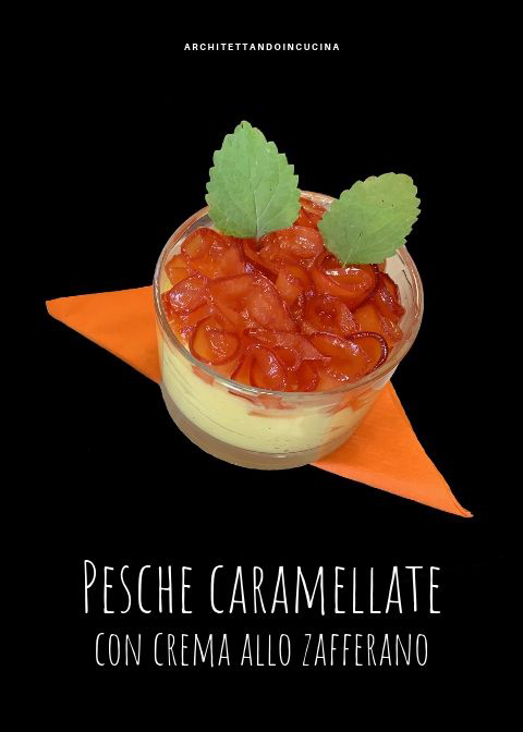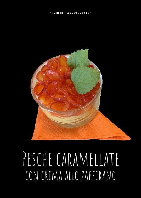 Questa estate, la ricorderemo per il caldo incredibile che rende tutto faticoso, anche cucinare. Ma io non mollo in particolare di fronte ad un dessert, fresco e profumato come questo, che non è molto dolce, ed in più ha come protagonista la pesca. E’ un frutto che nelle sue innumerevoli varietà ci accompagna per tutta l’estate ed al quale è dedicata la giornata odierna del Calendario del Cibo Italiano. Le pesche solitamente sono consumate al naturale, ma sono adattissime per diversi usi, dalle insalate, alle confetture come questa, o questa, o anche questa. La presento qui, semplicemente caramellata e accompagnata da una crema pasticcera aromatizzata allo zafferano. Un abbinamento davvero gradevole, per un dessert fresco e goloso.