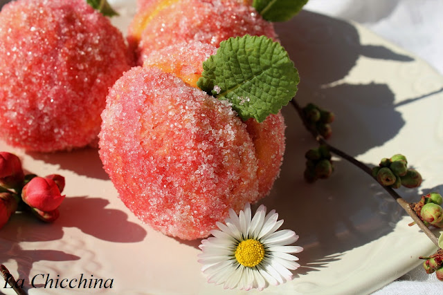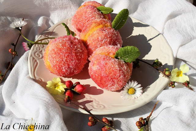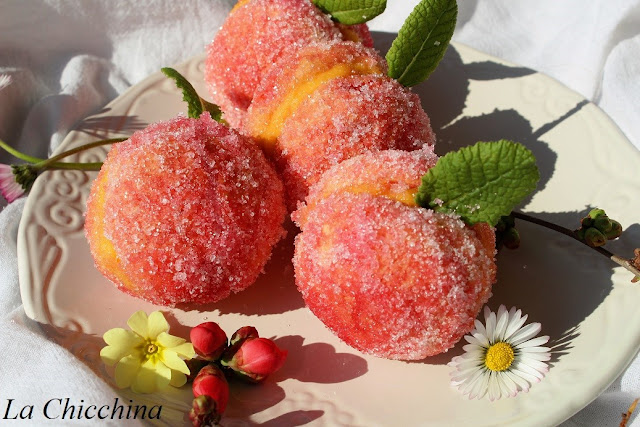 Ho gustato le finte pesche, la prima volta, preparate dalla maestra d’asilo di mio figlio Federico: voleva così bene a quel bambino piccolo piccolo (ora due metri o giù di lì) che, quando ha fatto la prima comunione, ne ha preparati due vassoi e, neanche a dirlo, sono letteralmente andati a ruba.