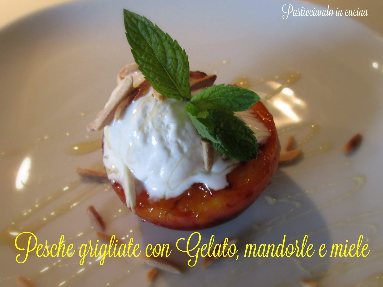 …una dolcissima pesca appena grigliata accompagnata con gelato fiordilatte, un cucchiaino di miele e delle croccanti mandorle tostate.