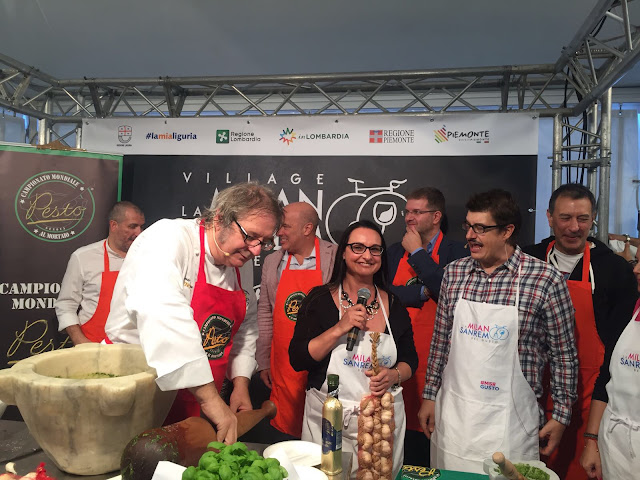 Mi sono trovata su un palco a Sanremo (ovviamente non all’Ariston!) davanti ad un tavolo imbandito con un mortaio in marmo, una piantina di basilico genovese, un aglio di Vessalico, una bustina di pinoli, sale marino, una bustina di Parmigiano Reggiano stravecchio, una bustina di Fiore Sardo ed una bottiglia di olio extra vergine di oliva Ligure.