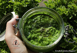 Una volte raffreddate su un telo da cucina le foglie, non vi resterà che inserirle con tutti gli ingredienti nel bicchiere del robot da cucina e frullare fino ad ottenere una salsa liscia e verde brillante.
