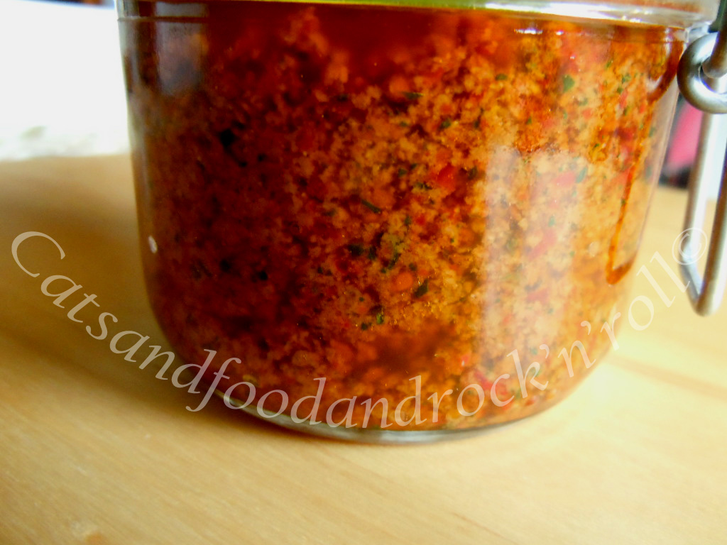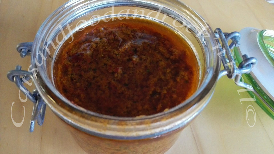 Questa è una salsina tuttofare, piccante a base di pomodorini secchi, una cosa che mi frullava nella testa da un po’ e che volevo fare col primo scotch bonnet red che stava maturando sulla pianta.