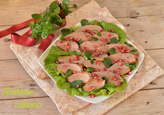 Preparare un letto di lattuga su un piatto di portata, disporre le fette di carne di anatra, cospargerlo di chicchi di melagrana e foglioline di menta.