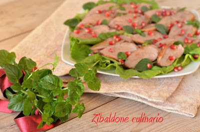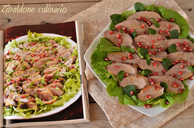 Preparare un letto di lattuga su un piatto di portata, disporre le fette di carne di anatra, cospargerlo di chicchi di melagrana e foglioline di menta.