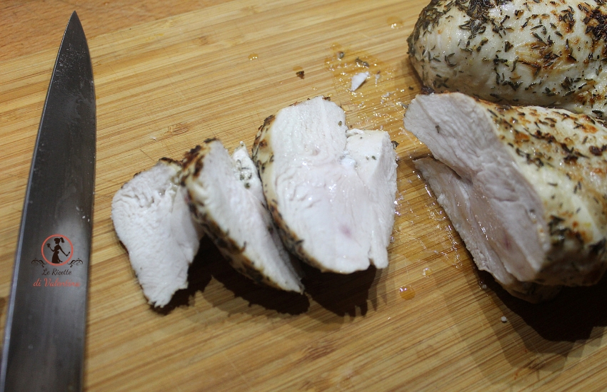 Una volta pronti, affettate il pollo in maniera obliqua e servite subito, con un contorno a vostra scelta.