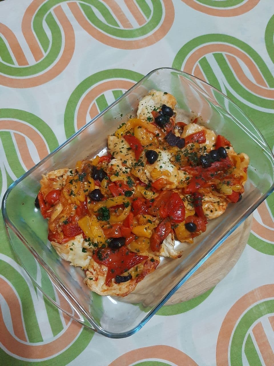 Rigirare ancora una volta, aspettare altri due minuti, spegnere il fuoco e servire questo buonissimo Petto di pollo con peperoni e olive