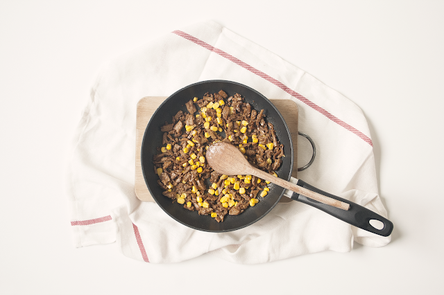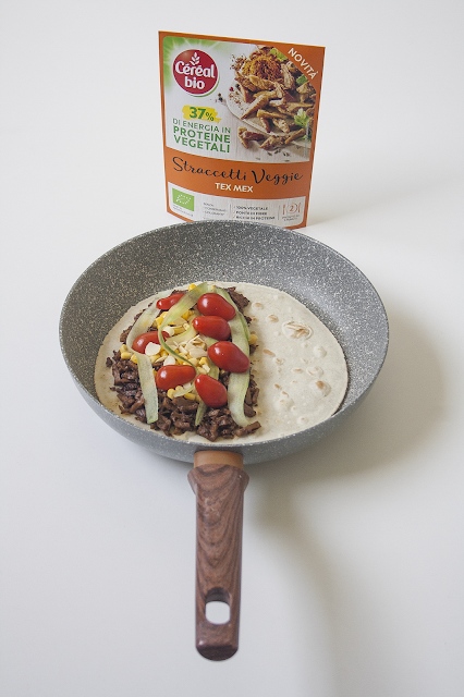 Successivamente versate il contenuto della confezione di straccetti veggie tex mex Céréal BIO in una padella e fate saltare a fuoco vivace per qualche minuto, dopodiché aggiungete anche il mais già scolato, mescolate e lasciate insaporire.