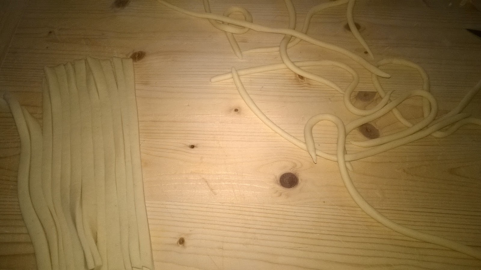 Prepariamo la nostra pasta fresca. Ho assaggiato questo formato in Toscana e me ne sono innamorata: sono i pici. Impasto la semola mista a farina 00 (rapporto 2:1) per un totale di 400 g con 4 uova. Tiro poi la sfoglia con il mattarello non troppo sottile. Taglio quindi a listarelle sottili e li strofino sulla spianatoia con entrambe le mani per dar loro la forma di tonnarelli.