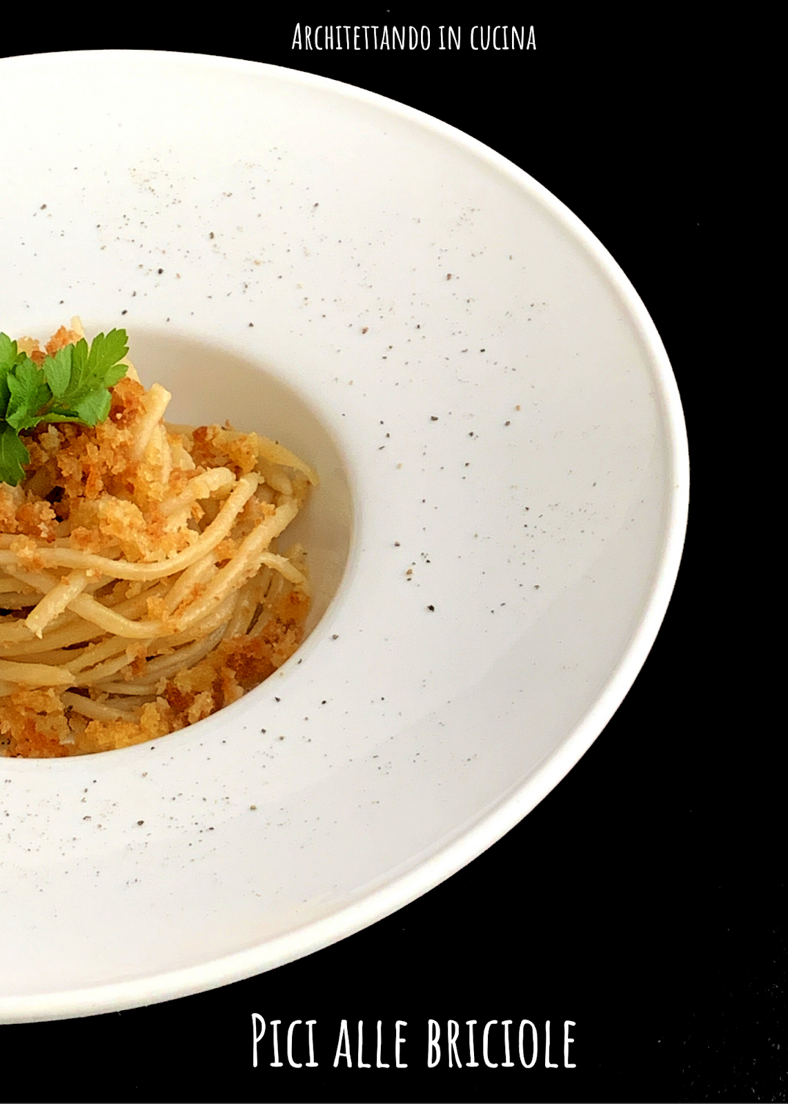 Togliere la crosta al pane raffermo e tritare la mollica. Far profumare parte dell’olio in un padellino che dovrà contenere i pici, con uno spicchio d’aglio e rosmarino (eventuale), poi tostarvi le briciole facendo attenzione a non farle bruciare. Metterle da parte. Nella stessa padella, far rosolare l’altro aglio, con il peperoncino e l’olio mancante, facendo attenzione a non farli bruciare. Togliere l’aglio ed il peperoncino. Cuocere i pici, scolarli con il ragno nella padella, un po’ di acqua di cottura e un po’ di pecorino e mantecare. Aggiungere le briciole e servire cosparso di pecorino e con prezzemolo tritato eventuale.