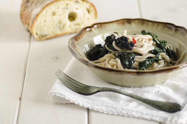 Tagliate l’aglio Ursino, mettetelo in padella con olio extravergine di oliva e il peperoncino, unite il cavolo riccio e fatelo cuocere qualche minuto aggiungendo acqua della pasta se troppo asciutto.