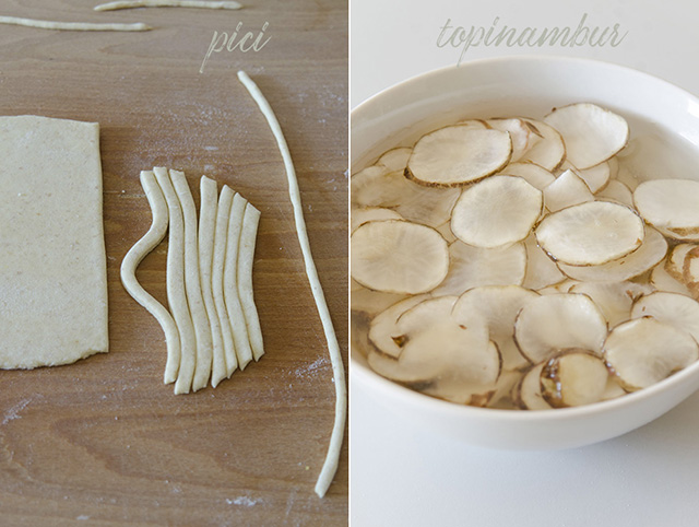 Ho voluto però cimentarmi con un condimento insolito, il topinambur è rustico e rurale come i pici stessi, inutile dire che l’abbinamento è riuscito.