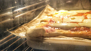 Per la pasta della pizza potete leggere qui la mia ricetta, una volta pronta ho steso la pasta sopra un foglio di carta forno e l’ho condita con pomodoro (a cui avevo precedentemente aggiunto olio e sale) e mozzarella, con l’aiuto della pala l’ho fatta scivolare sulla pietra e cotta per 6 minuti perché avevo messo molto condimento, altrimenti ce ne voglio di meno.
