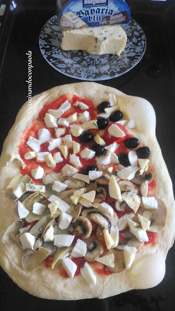 la mozzarella e il Gorgonzola tagliati a cubetti e un filo d’olio.