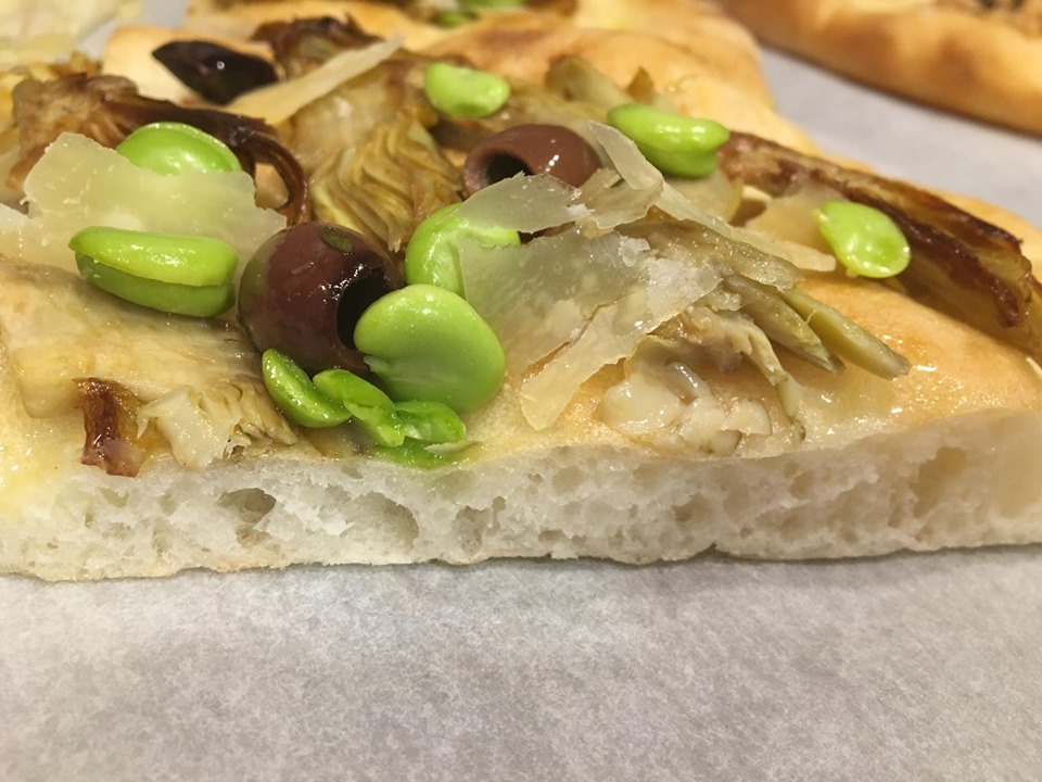 | Cottura base bianca e ingredienti aggiunti a crudo: carciofi saltati in padella e fave sbollentate poi olive e grana in scaglie |