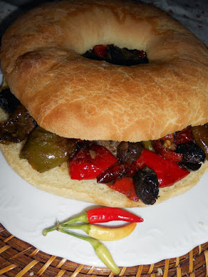 Ma adesso andiamo alla pitta che di solito io farcisco con peperoni fritti con sarde salate e olive nere.