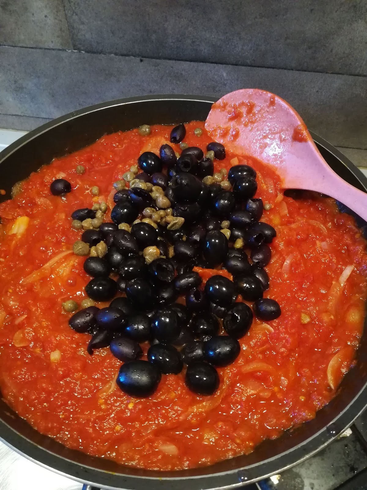 A metà cottura unire olive e capperi e quando il sugo sarà pronto spegnere la fiamma