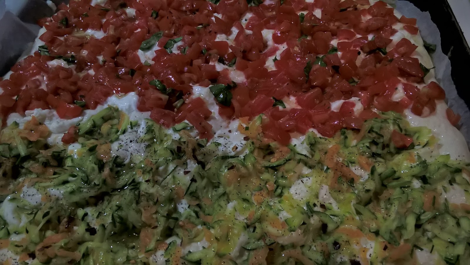 Passate le 24 ore, tirate fuori l’impasto e stendetelo su una teglia con le dita (potete aiutarvi ungendovele con l’olio); coprite con la pellicola e fate lievitare per altre 2/3 ore, stavolta non in frigo (io la metto nel forno con la luce accesa). Fatto questo, potete sbizzarrirvi con la fantasia per il condimento, senza dimenticare che il segreto è costituito dalla qualità dei prodotti che usate.
