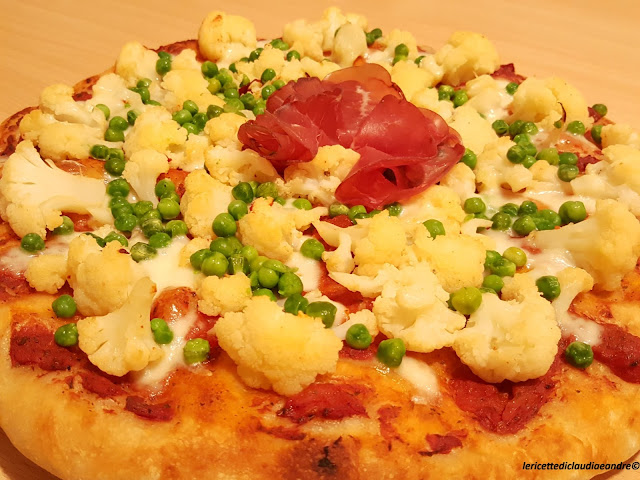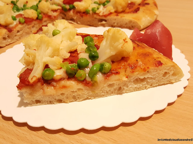 Pizza a lunga lievitazione con cavolfiore, pisellini, mozzarella, bresaola e lievito madre
