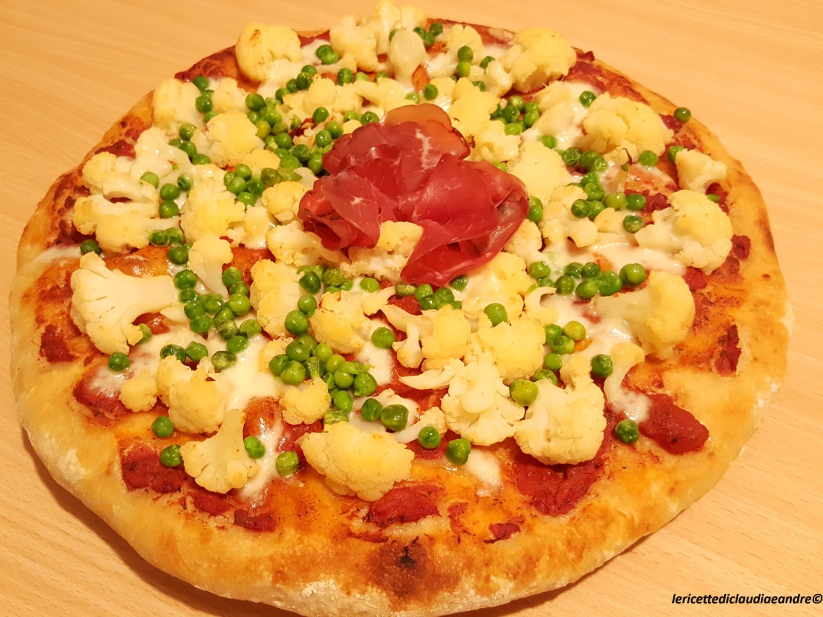 Pizza a lunga lievitazione con cavolfiore, pisellini, mozzarella, bresaola e lievito madre