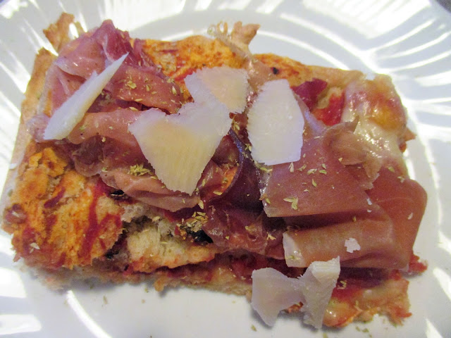 Quand il est prêt, cuit au four et servi avec des tranches de prosciutto et fromage parmesan flocons.