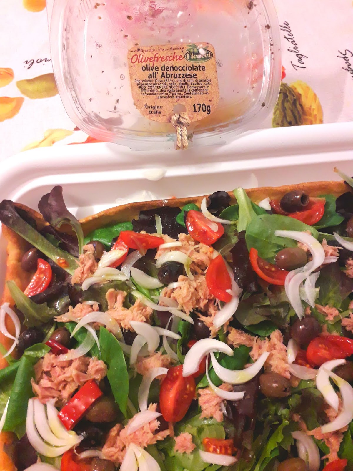 Una volta cotta attendere che raffreddi e cospargere prima con insalata mista,poi pomodorini
