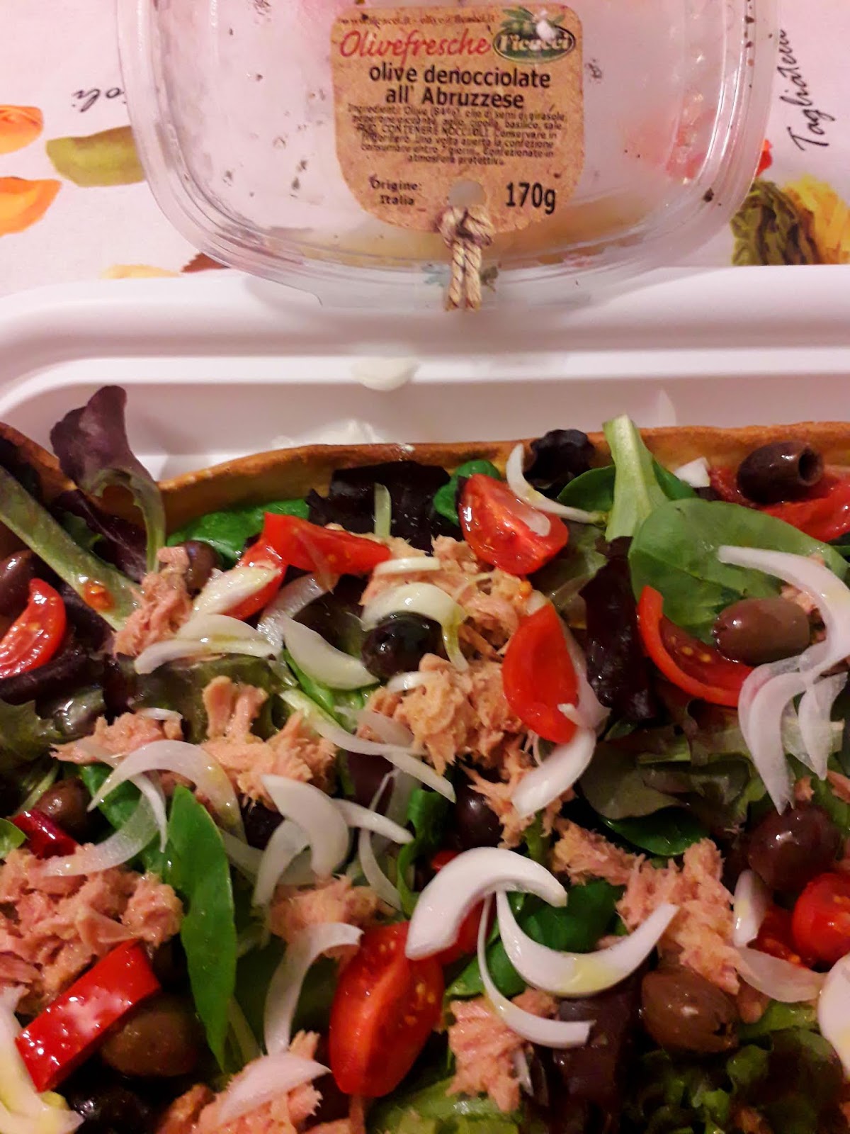 affettati,cipolla ,tonno , olive e olio a filo…..