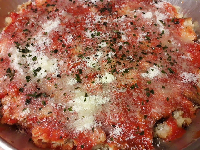 con pomodoro,grattugiato ,basilico e olio a filo,infornare x 10′ a circa 200°,poi riprendere