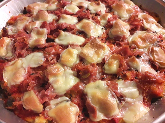 la teglia e farcire con scamorza e mortadella,infornare ancora x atri 5′e spegnere,