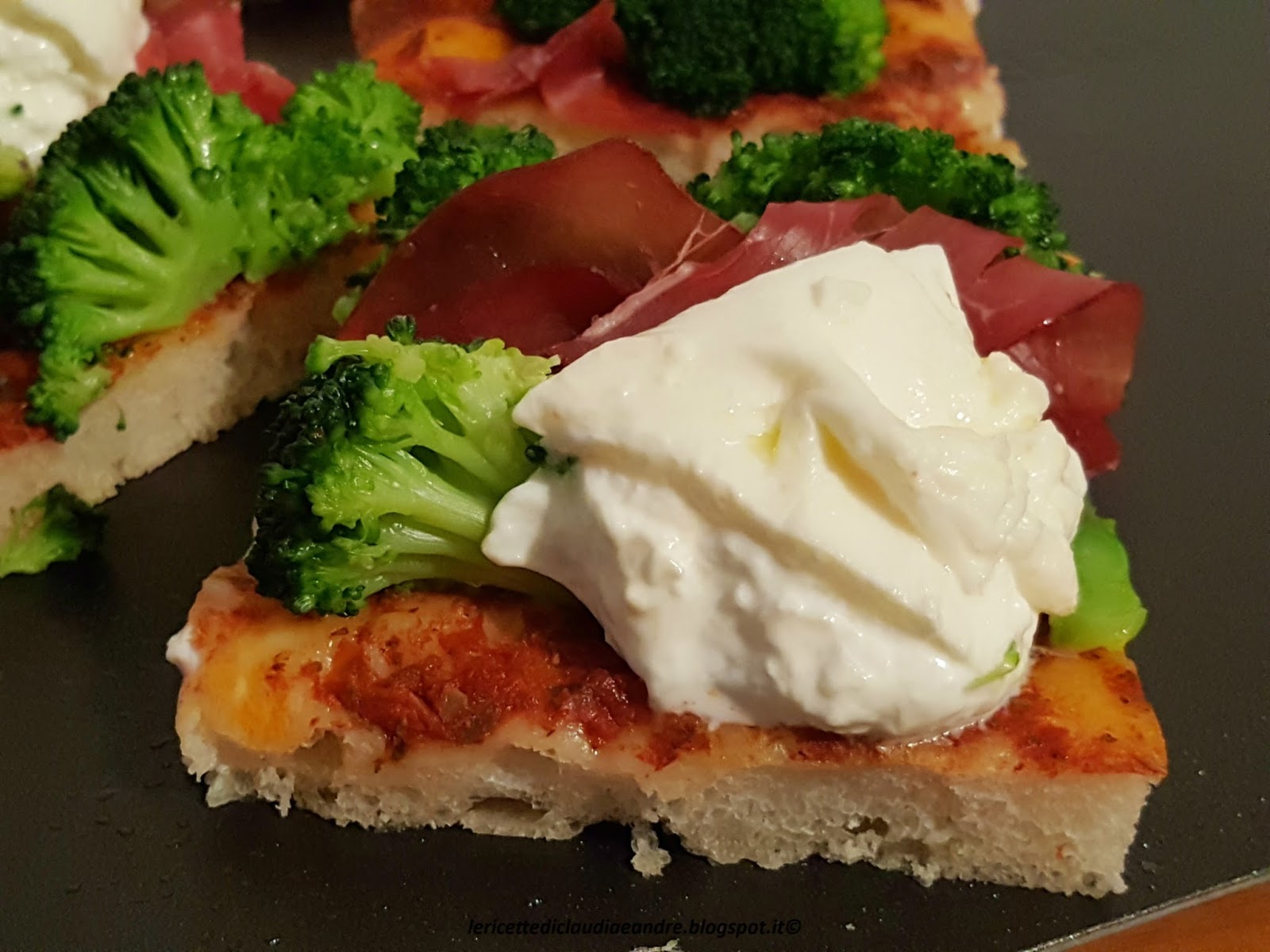 - Per la pizza 2 : Ingredienti : 1 broccolo di media grandezza; 150 gr salsa di pomodoro fatta in casa; 300 gr burrata; 70 gr bresaola; olio extravergine d’oliva