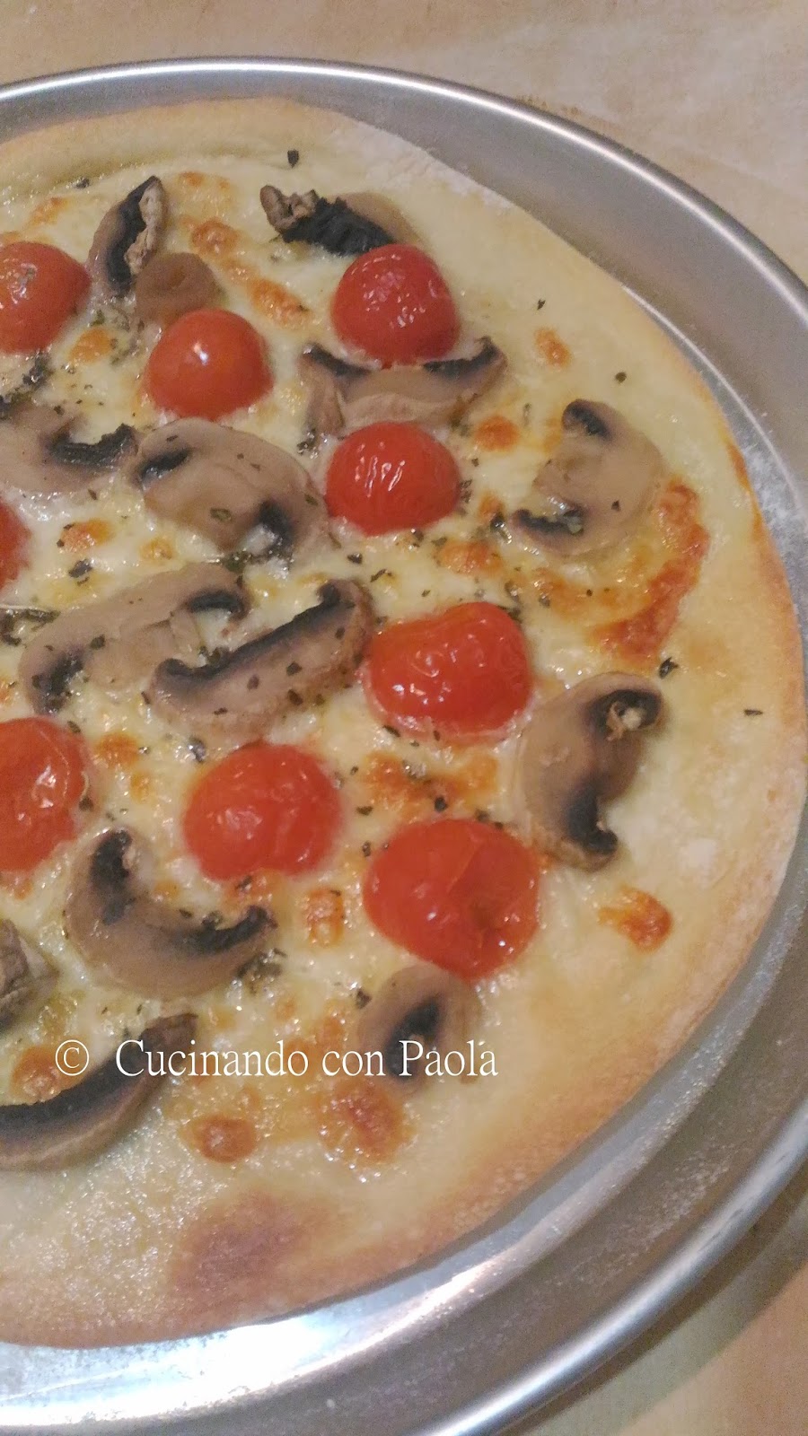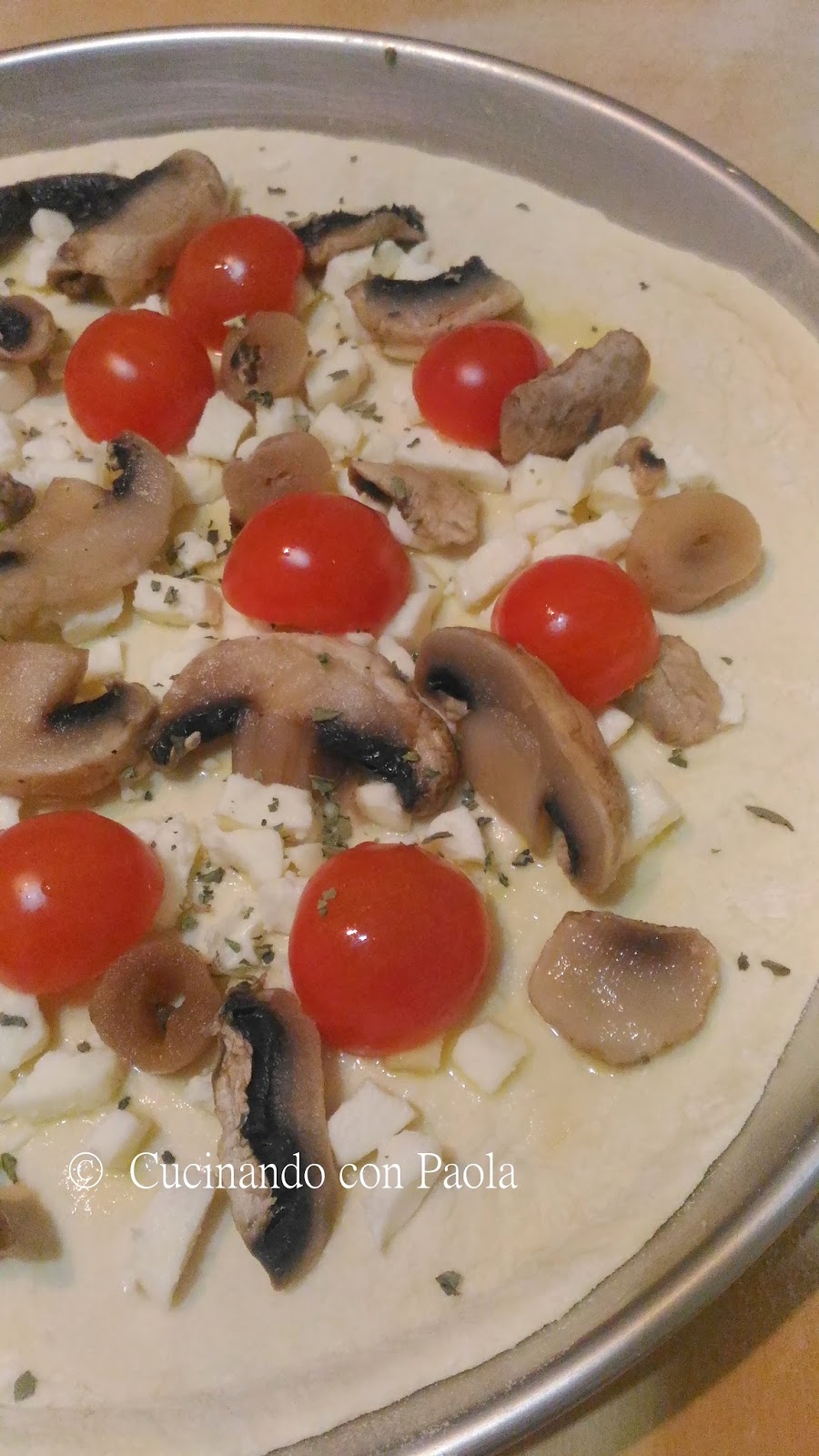 Prendete le 4 pagnottine ben lievitati e stendeteli su una spianatoia ben infarinata fino a formare 4 dischi rotonde e sottili. Lavate i pomodorini e tagliateli a metà. Tagliate a fette la mozzarella di bufala per me il cubettato di mozzarella Terrantica ; pulite i funghi eliminando la parte terrosa del gambo e la pelle della cappella, poi tagliateli a fette sottili. Disponete i dischi delle pizze sulle teglie leggermente unte con l’olio d’oliva; disponetevi sopra le fette di mozzarella e ricoprite gli spazi vuoti con i mezzi pomodorini e i funghi. Condite con poco olio d’oliva, salate e spolverate con l’origano.