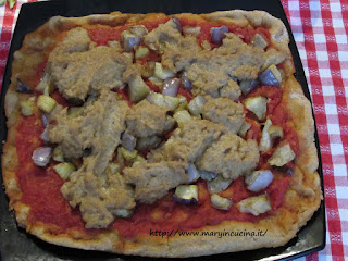 Versare la passata sulle pizze e distribuirla, distribuire anche le melanzane e la formaggetta a cucchiaiate.