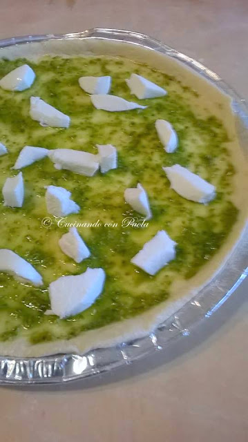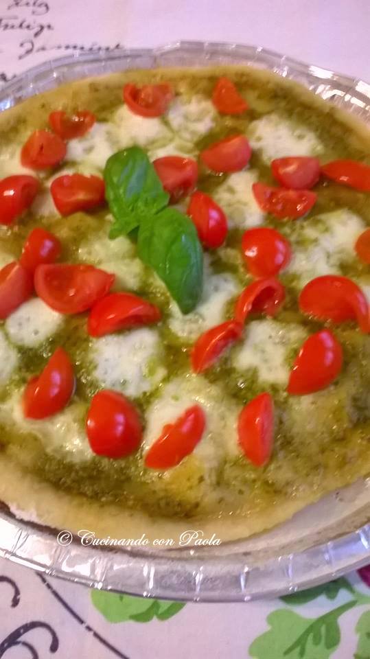 Ora prepariamo il condimento per la pizza: tagliate a cubetti la mozzarella e i pomodorini in quattro e conditeli con olio e origano. Ora riprendete l’impasto della pizza e formate quattro panetti. Stendete le varie pizze e mettetele in una teglia unta d’olio. Cospargete con il pesto e la mozzarella a cubetti, versate un filo d’olio e salate. Infornate nel forno preriscaldato a 220°C per 5 minuti. Togliete le pizze dal forno e completate con i pomodorini conditi con olio e origano. Infornate di nuovo per 10-15 minuti. Servite ben caldi con il basilico fresco e rucola a piacere (che non avevo ahimè!)