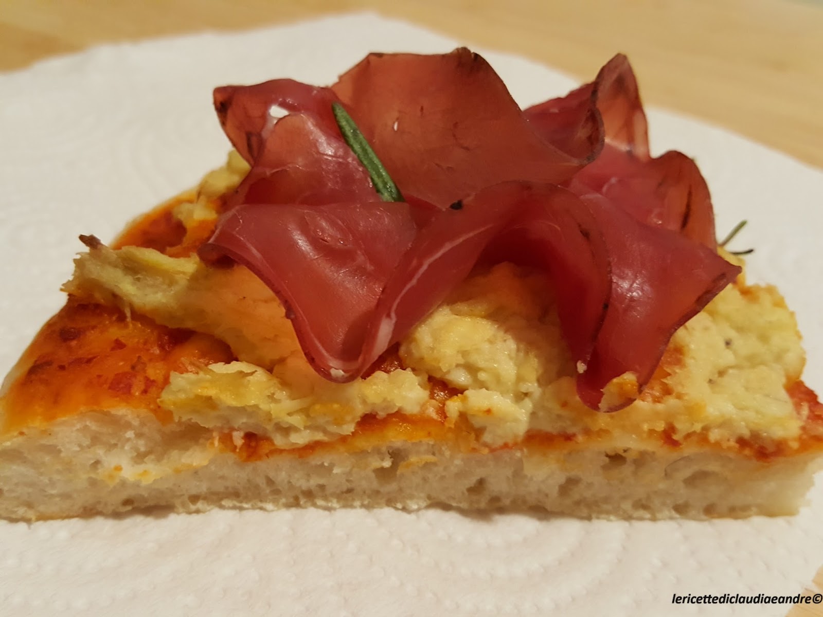Pizza con salsa di peperoncini piccanti, crema di carciofi e bresaola