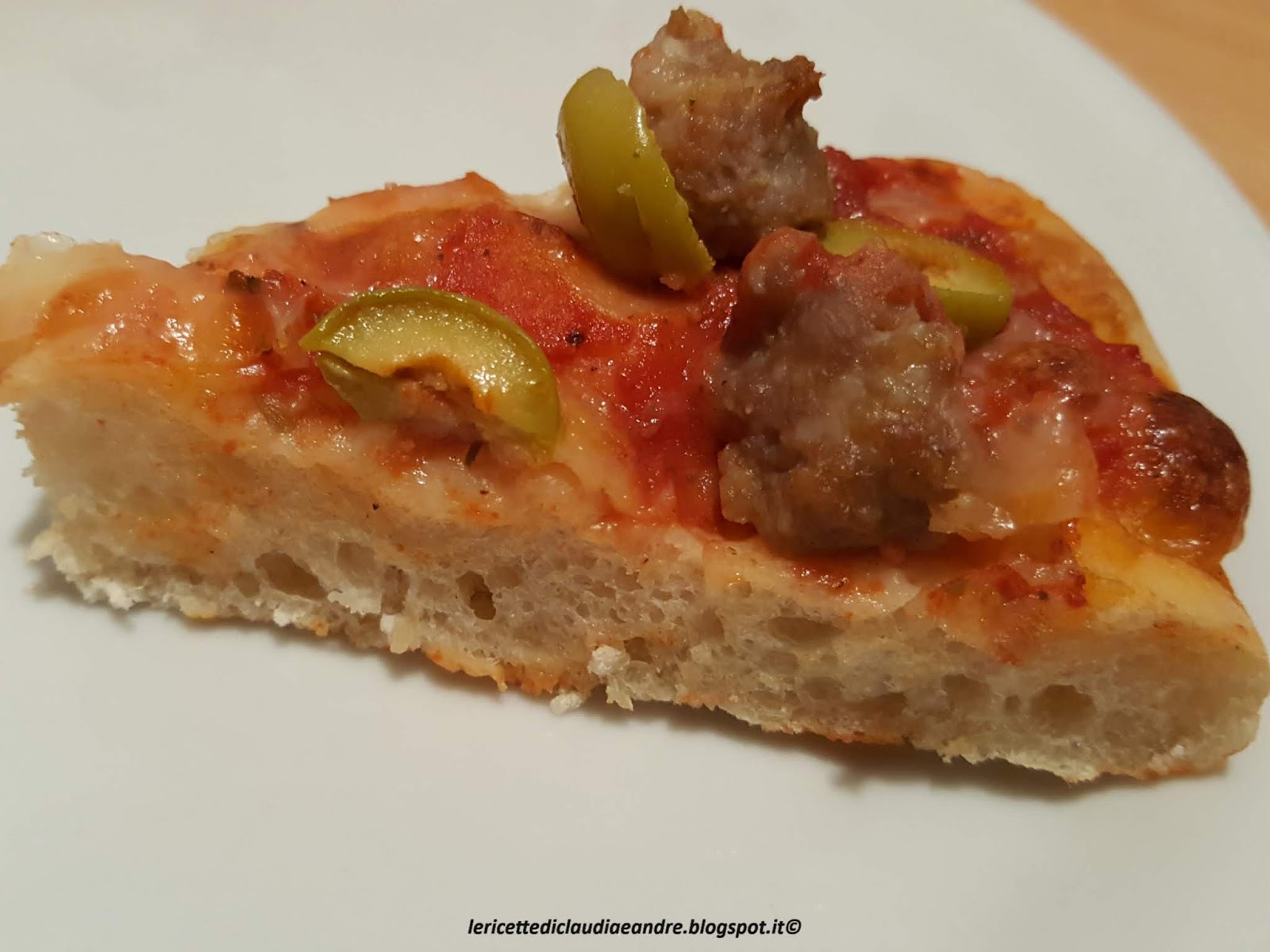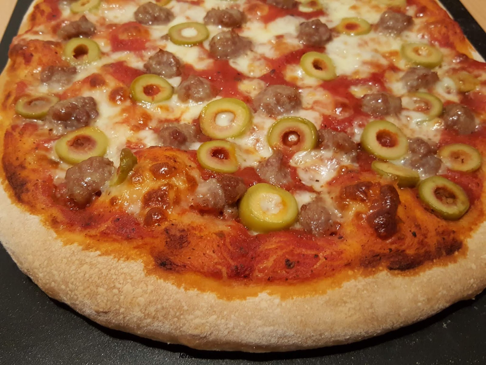 - Trascorso il tempo e la pizza e lievitata, condire con la salsa di pomodoro, mozzarella, la salsiccia tirata dal suo budello a pezzi e le olive tagliate a rondelle.